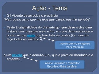 Este documento analisa a peça "Auto da Mãe Preta" de Gil Vicente. A peça conta a história de Inês, uma jovem que deseja se casar para ganhar liberdade. Ela primeiro se casa com um escudeiro mentiroso, depois aceita se casar com Pêro Marques, um lavrador simples mas honesto, realizando seu objetivo. A peça critica os tipos sociais da época através do uso de ironia e personagens que representam esses tipos.