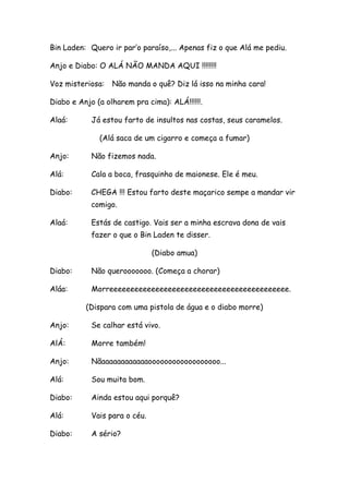 Bin Laden questiona o Diabo sobre seu destino após a morte, acreditando que iria para o paraíso por ter seguido os ensinamentos de Alá. No entanto, tanto o Diabo quanto um Anjo afirmam que Alá não manda no inferno ou no céu. Uma voz misteriosa se revela como sendo Alá, que pune o Diabo e o Anjo por questionarem sua autoridade, forçando-os a servirem Bin Laden e limpar retretes, respectivamente. No final, Alá leva Bin Laden para seu palácio para desfrutar de