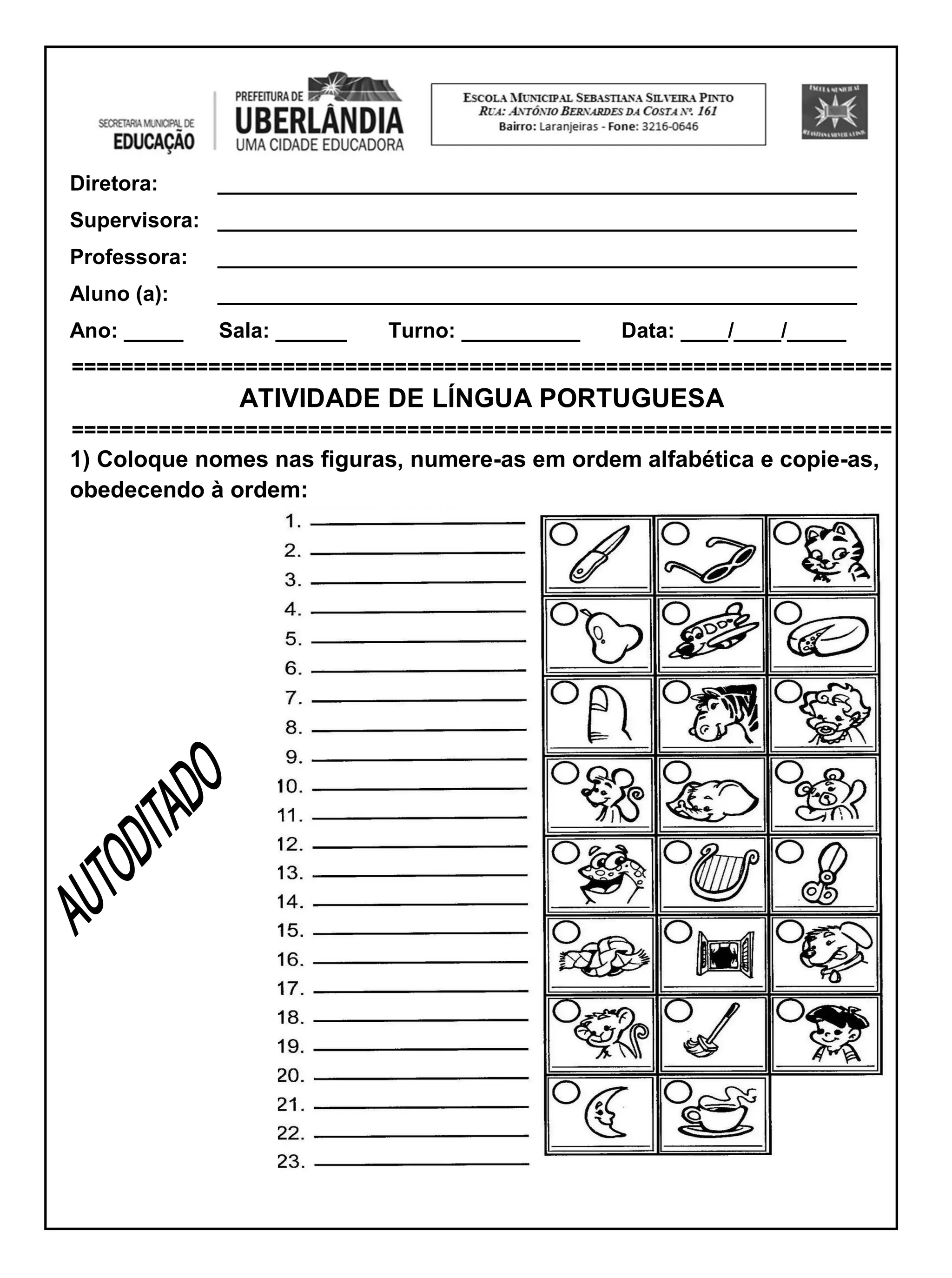 O documento pede para 1) colocar nomes nas figuras representando uma diretora, supervisora, professora e aluno(a), numerá-las em ordem alfabética e copiá-las nessa ordem. Deve-se também preencher o ano, sala, turno e data.
