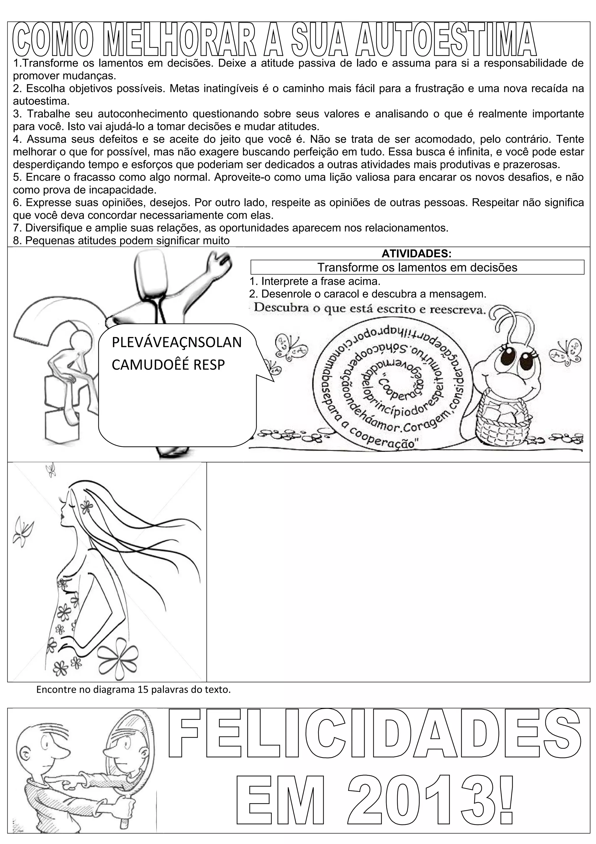 O documento discute estratégias para promover mudanças positivas na vida, como transformar lamentos em ações concretas, estabelecer metas alcançáveis, autoconhecimento, aceitação de defeitos, encarar fracassos como lições, respeito às opiniões alheias e ampliação de relacionamentos.