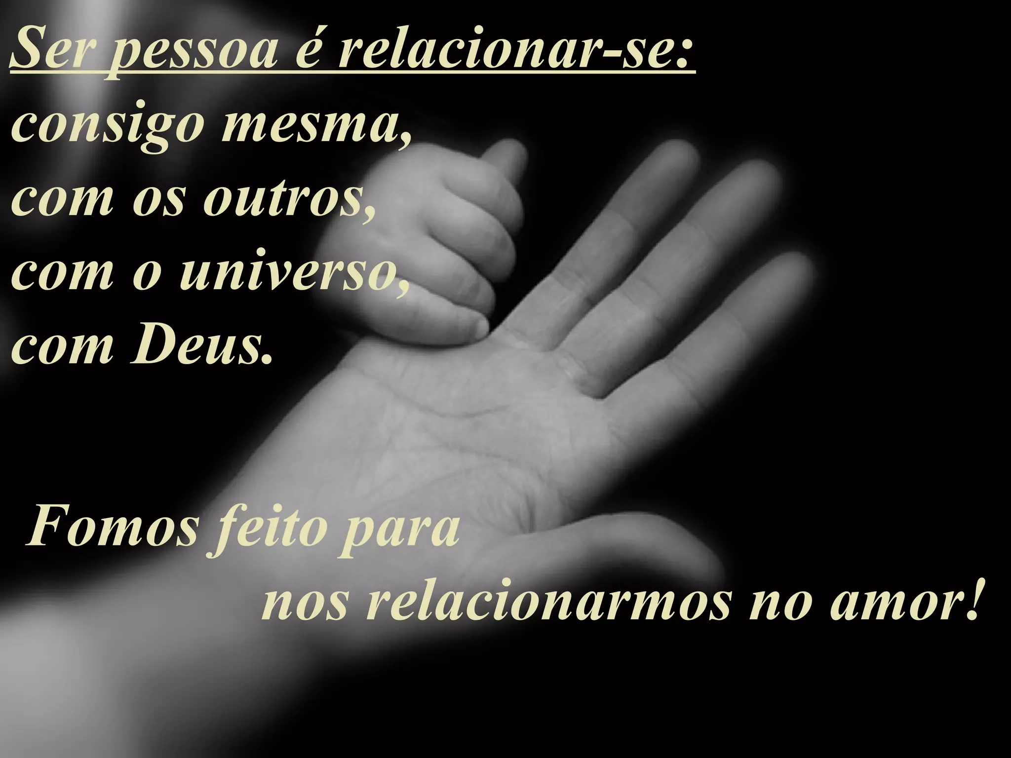 O documento discute a importância da autoestima e dos relacionamentos positivos consigo mesmo, com os outros e com Deus para o desenvolvimento humano. Afirma que as pessoas foram criadas para se relacionarem no amor e que a autoaceitação e o autocuidado levam à felicidade e ao bem-estar. Também ressalta a necessidade de diálogo e perdão nas interações com os semelhantes.