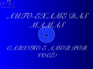 O documento fornece instruções sobre como realizar auto-exame das mamas, incluindo como examinar visualmente e por toque, o que procurar, quando fazer e a importância para a detecção precoce do câncer de mama. Recomenda que as mulheres comecem a fazer o auto-exame a partir dos 20 anos e que o repitam mensalmente, preferencialmente durante o banho.