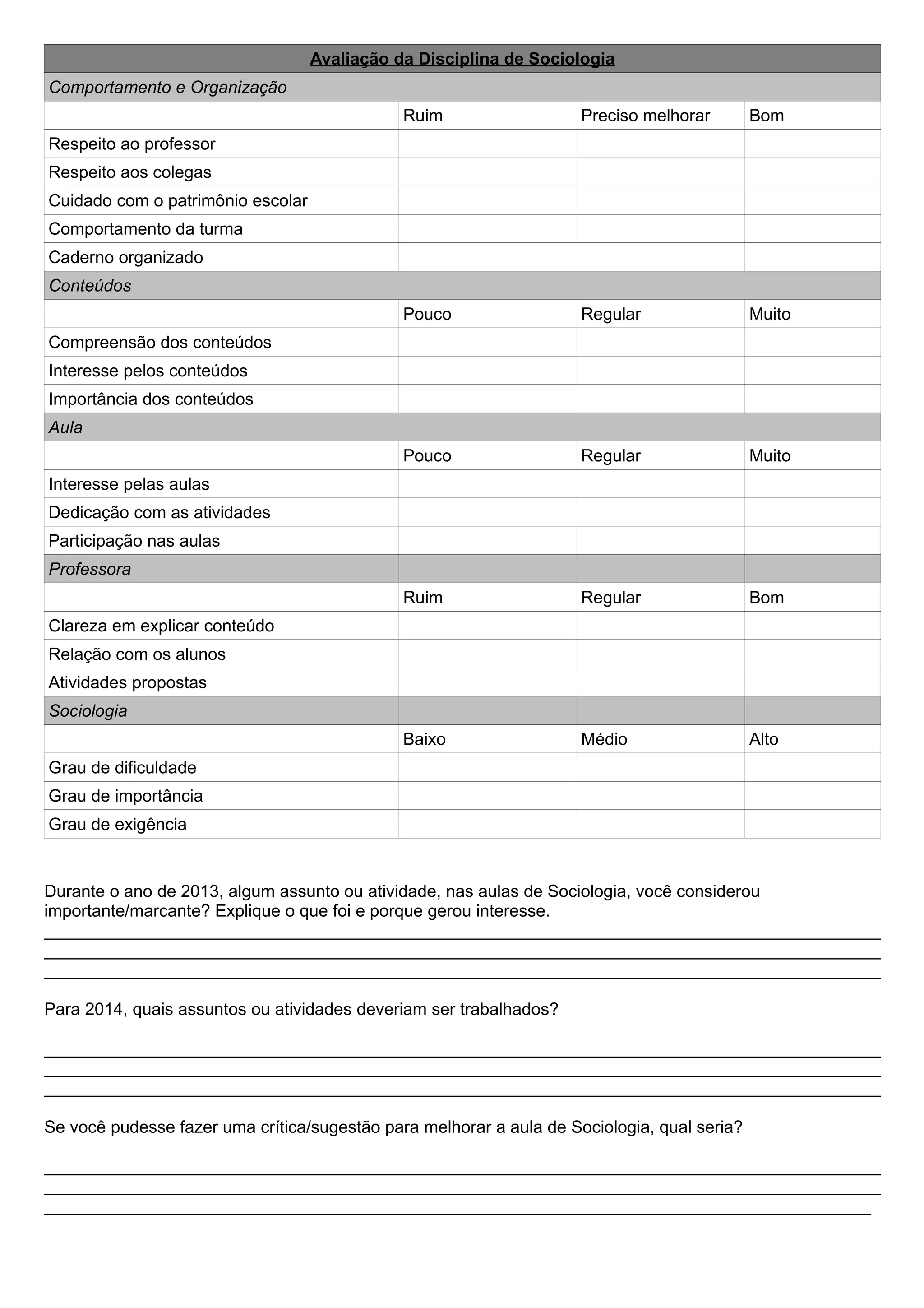 Este documento apresenta uma avaliação da disciplina de Sociologia feita por alunos. Eles avaliaram aspectos como comportamento, organização, conteúdos, aulas, professora e a própria disciplina de Sociologia. Os alunos também deram sugestões para melhorar a disciplina no futuro.