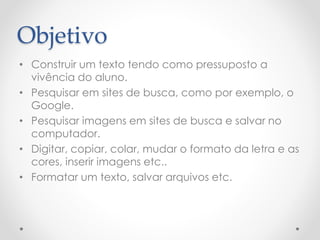 Este documento descreve um projeto da Educação de Jovens e Adultos (EJA) no qual os alunos escreverão autobiografias curtas utilizando o Microsoft Word e PowerPoint. O projeto visa ajudar os alunos a pesquisar informações online, formatar textos e inserir imagens. Os alunos preencherão uma ficha com seus dados, pesquisarão o significado de seus nomes, construirão acrósticos e escreverão autobiografias, formatando-as com recursos como fontes e alinhamento. O produto final será