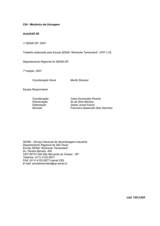 Este documento fornece instruções sobre como usar o software AutoCAD 2D. Ele explica como inicializar o programa, os sistemas de coordenadas, comandos básicos como linha, apagar e desfazer, ferramentas como zoom, camadas, e ferramentas de precisão. O documento também inclui exercícios para o leitor praticar os comandos ensinados.
