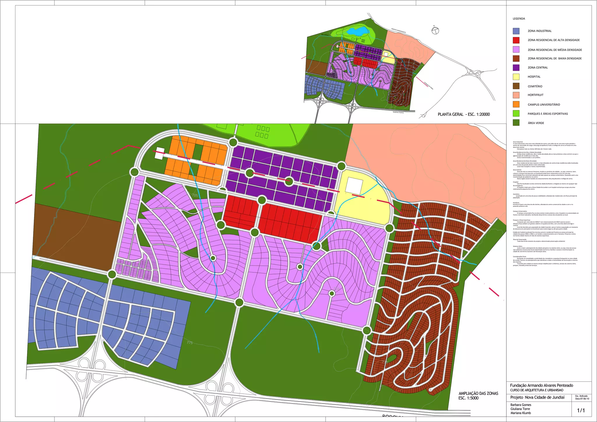 O documento descreve diferentes zonas de uma cidade, incluindo uma zona industrial com cerca de 100 lotes de 1 hectare cada, zonas residenciais de alta e baixa densidade, uma zona central com comércio e lazer de cerca de 6 hectares, um hospital pequeno perto do centro, e uma zona de hortifrutigranjeiros ligada por uma ciclovia à rodovia.