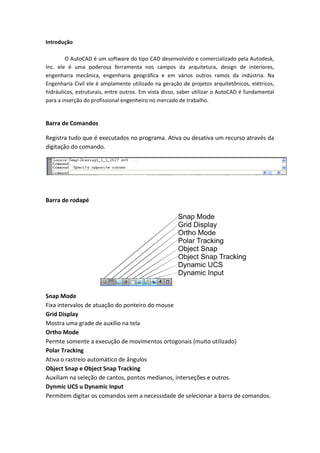 Este documento fornece instruções básicas sobre como utilizar o software de CAD AutoCAD. Ele explica os principais comandos como linha, retângulo, arco e tabela, e ferramentas como barra de comandos, grade e rastreamento polar. Além disso, fornece detalhes sobre como configurar e criar dimensões para projetos no AutoCAD.