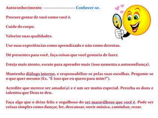 O documento discute como cultivar a autoestima, identificando características de pessoas com baixa e alta autoestima. Sugere que aumentar a autoestima requer mudanças de comportamento como estabelecer metas, ajudar os outros, e se concentrar em coisas positivas.