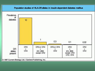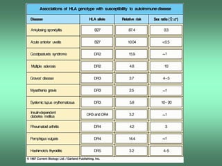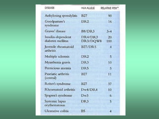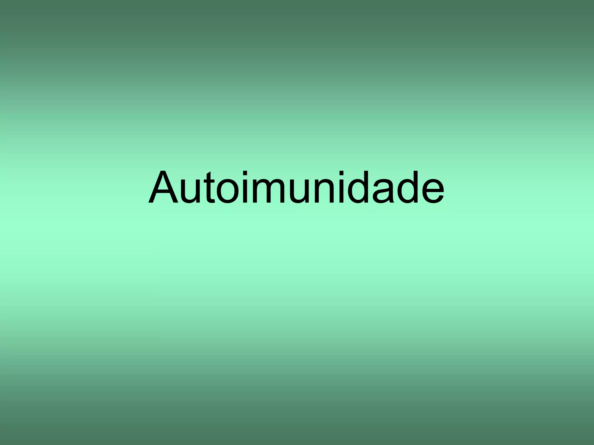 O documento discute conceitos de autoimunidade, doenças autoimunes e seus mecanismos. Especificamente, define autoimunidade como resposta imune contra antígenos próprios e doença autoimune como síndrome provocada por lesão tecidual ou alteração funcional desencadeadas por resposta autoimune. Também descreve mecanismos como falha na educação tímica, ruptura da tolerância periférica e mimetismo molecular que podem levar a respostas autoimunes.