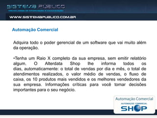 O documento descreve um software de automação comercial que fornece relatórios diários e mensais sobre vendas, atendimentos, fluxo de caixa e produtos mais vendidos. O software também auxilia no processo de compras, emissão de notas fiscais, controle financeiro e integração de múltiplas lojas.
