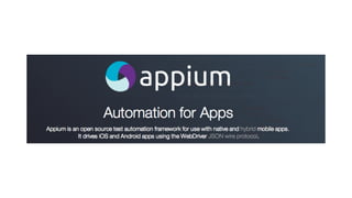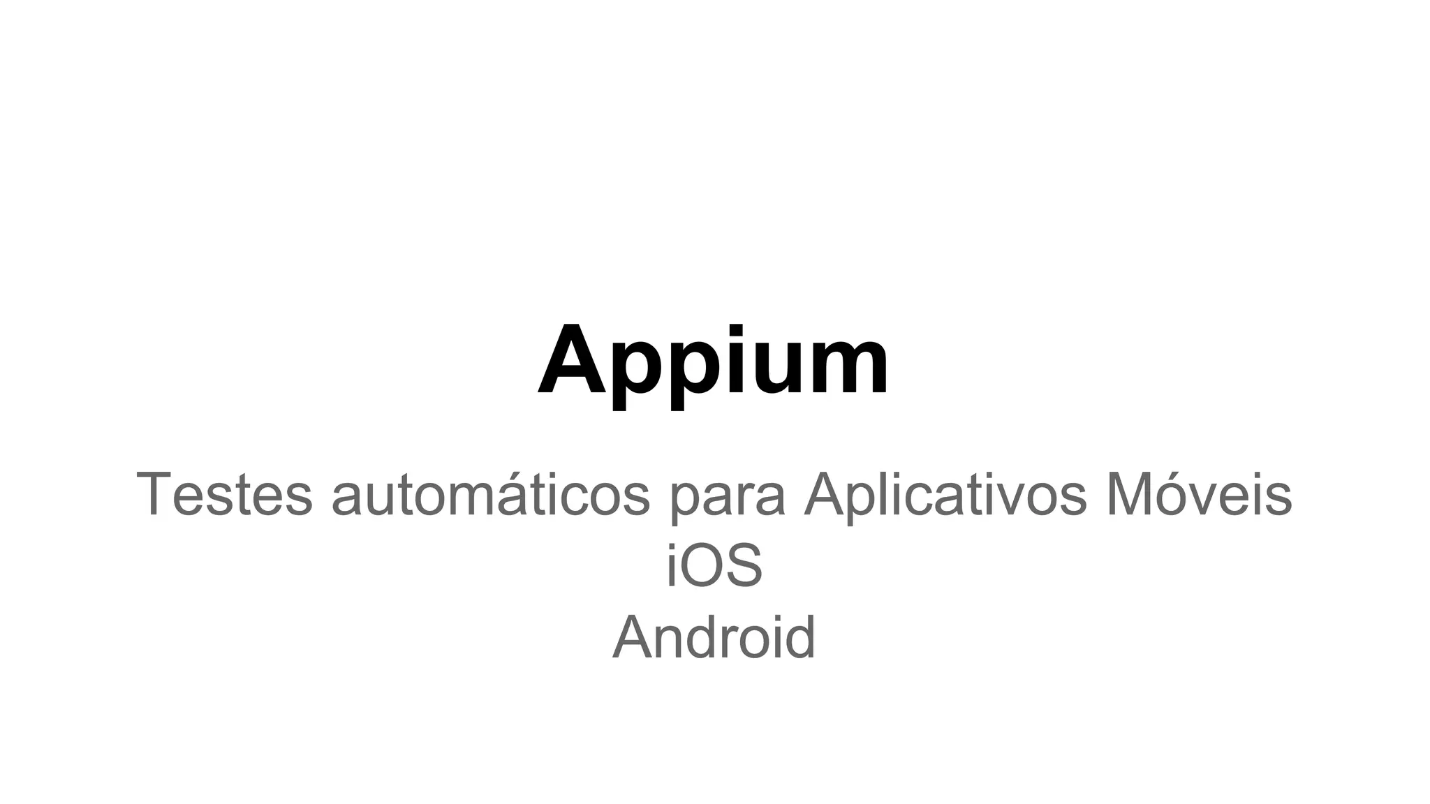 Este documento apresenta a ferramenta Appium para testes automatizados de aplicativos móveis, que suporta plataformas como iOS e Android, permite escolher linguagens de programação e padrões de design, e é compatível com a biblioteca Selenium WebDriver. Ele explica como configurar e executar testes automatizados usando o Appium e compara com outras ferramentas de teste.