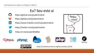 Este documento discute como automatizar o processo de deploy usando as ferramentas open source Deployer e Gitlab CI. O Deployer é uma ferramenta flexível em PHP para automatizar tarefas como deploy, e pode trabalhar com diversos sistemas como Capistrano, Mina e Ant. O Gitlab CI é uma ferramenta de integração contínua hospedada no Gitlab que pode ser usada para implementar fluxos de trabalho de CI/CD. Ao usar essas duas ferramentas juntas, é possível criar um pipeline de deploy automatizado para implantar có