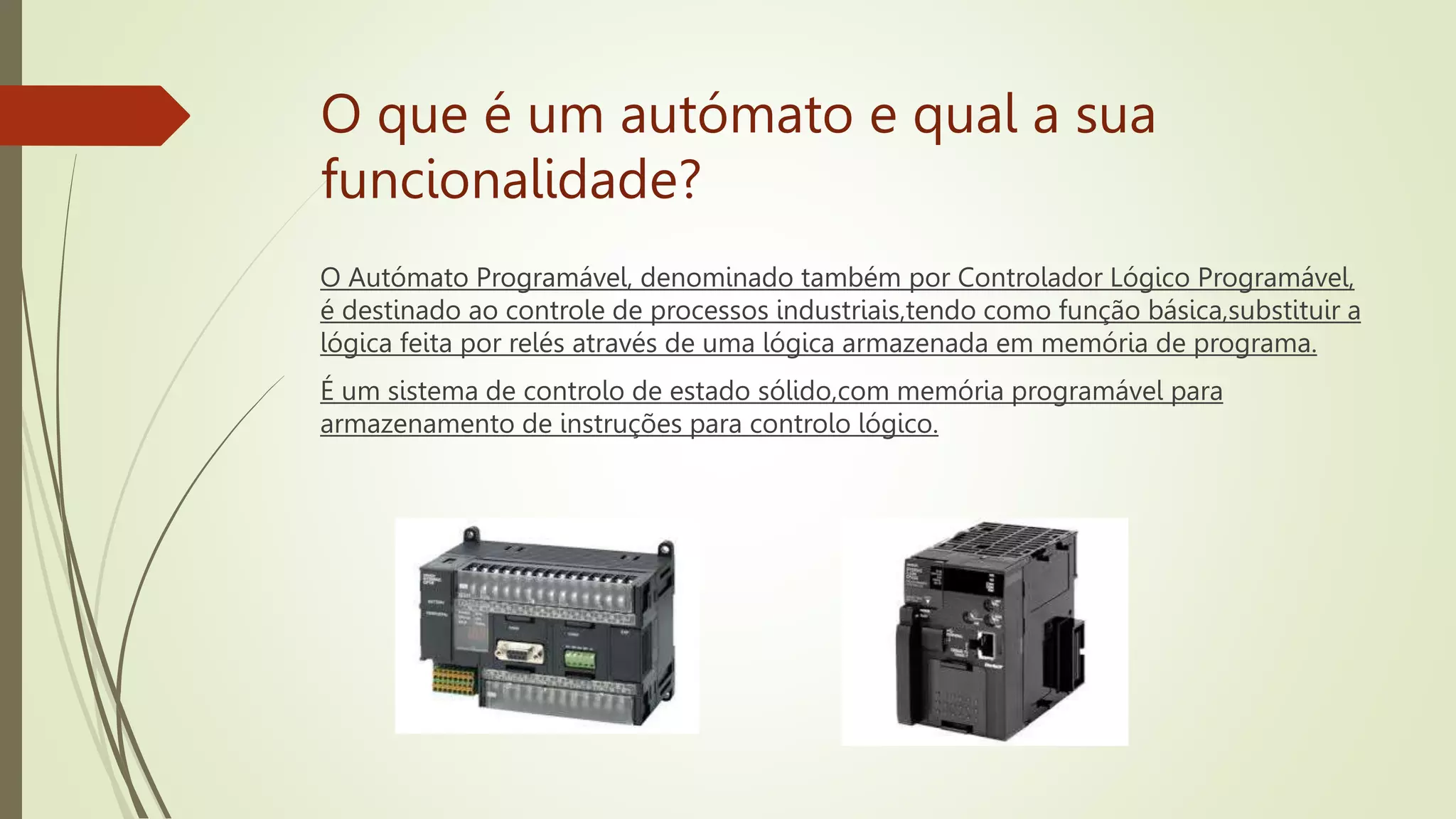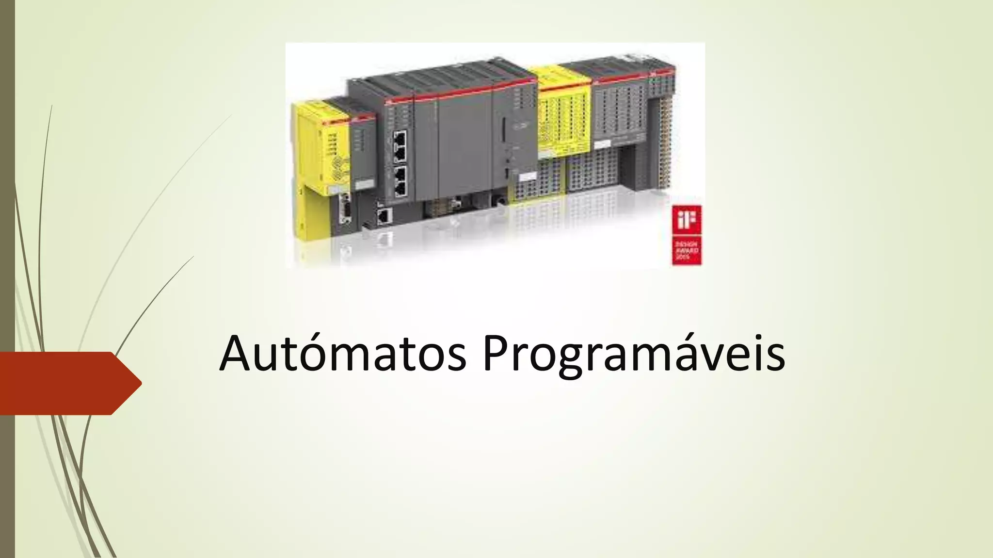 O documento descreve o que são autómatos programáveis e sua funcionalidade, substituindo a lógica de relés por uma lógica armazenada em memória. Discutem as principais vantagens dos autómatos programáveis em relação aos painéis de relés, como redução de custos, facilidade de programação e configuração. Também menciona que a GM desenvolveu o primeiro autómato programável na década de 1960 para automatizar linhas de montagem.