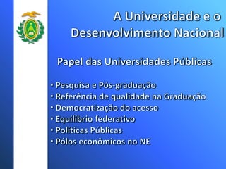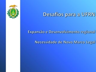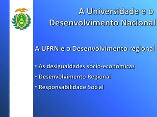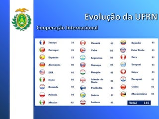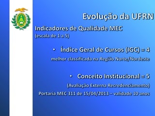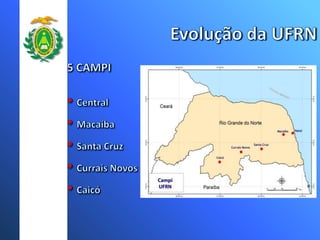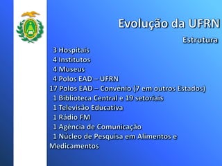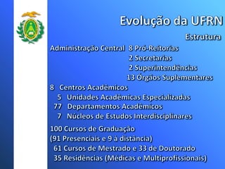 A Universidade Federal do Rio Grande do Norte (UFRN) teve um crescimento significativo no número de cursos, campus, vagas e programas de pós-graduação nos últimos anos. Atualmente a UFRN possui 51 cursos de graduação distribuídos em 8 campus, com mais de 3 mil vagas anuais. O número de programas de pós-graduação stricto sensu também aumentou para 20 programas de mestrado e doutorado.