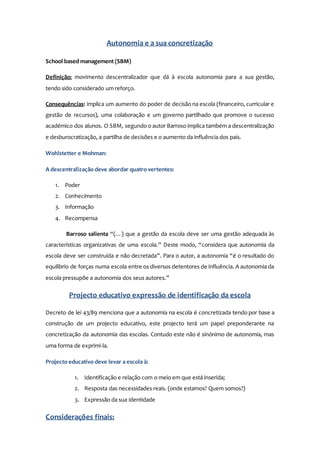 O documento discute definições e características da autonomia escolar de acordo com autores como Barroso e Macedo. A autonomia é construída através da auto-organização e inter-relação com outros, não algo já adquirido. Inclui dimensões jurídico-administrativas e socio-organizacionais e deve ser adequada às características de cada escola.