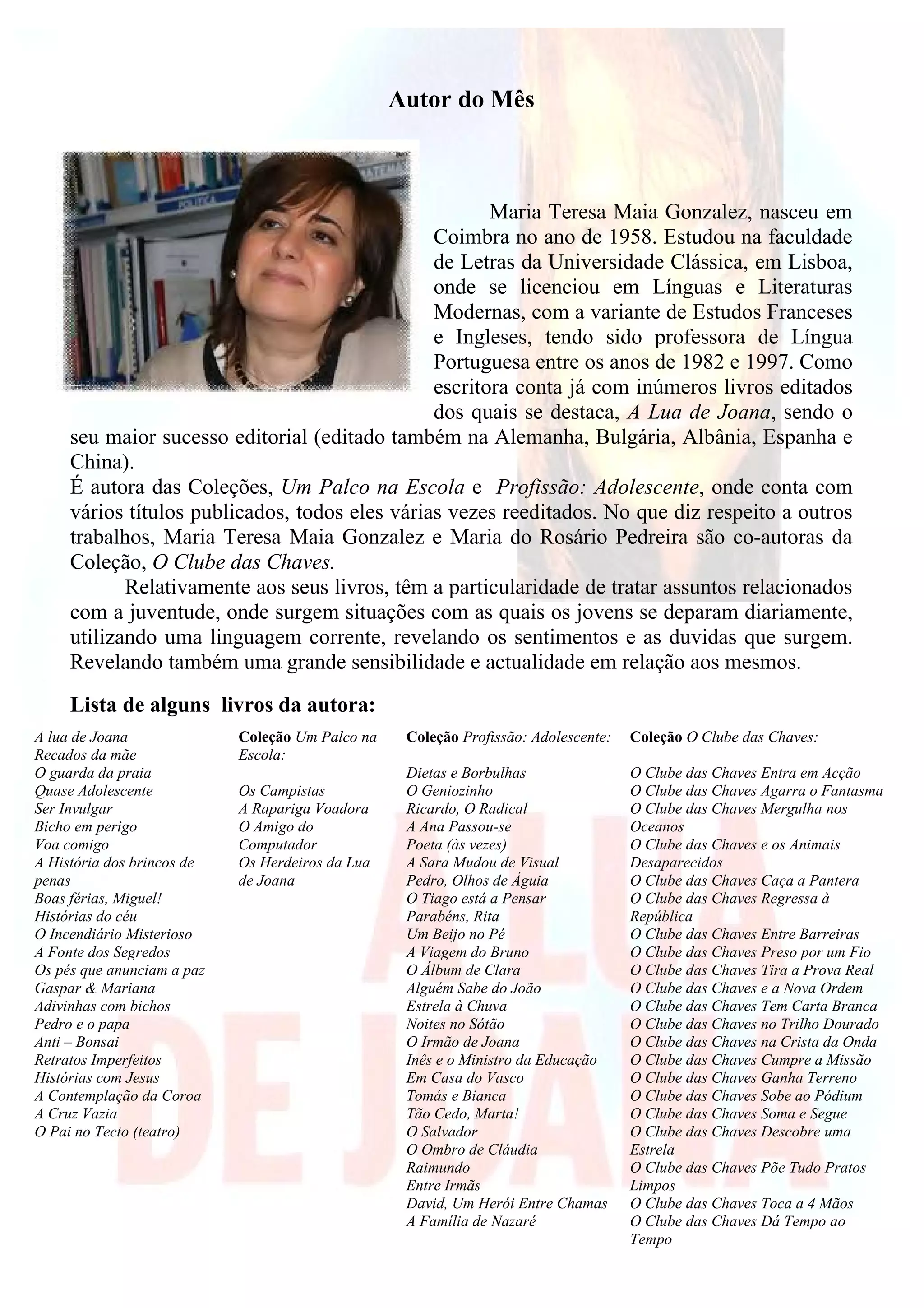 O documento descreve a escritora portuguesa Maria Teresa Maia Gonzalez. Ela nasceu em 1958 em Coimbra e estudou literatura moderna em Lisboa. Gonzalez escreveu muitos livros populares para jovens, focando em assuntos e sentimentos que eles enfrentam diariamente. Seu livro mais bem sucedido foi "A Lua de Joana".