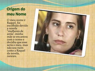 Raquel fala sobre sua vida, incluindo seu nome inspirado por uma novela, seus sonhos de se tornar médica que mudaram após ter um filho, e onde atualmente trabalha e passa seu tempo. Ela também descreve ter crescido na Bahia até os 12 anos e as dificuldades de se adaptar em São Paulo, bem como as pessoas que a inspiraram e os valores que a guiaram a superar desafios. Seu maior sonho agora é ver sua filha realizar os dela.