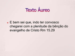O documento discute o evangelho de Cristo, definindo-o como uma mensagem de vitória sobre o mal e salvação para a humanidade. Também destaca a importância da fé para receber o evangelho e produzir frutos, e como o evangelho traz esperança e paz entre Deus e os crentes.
