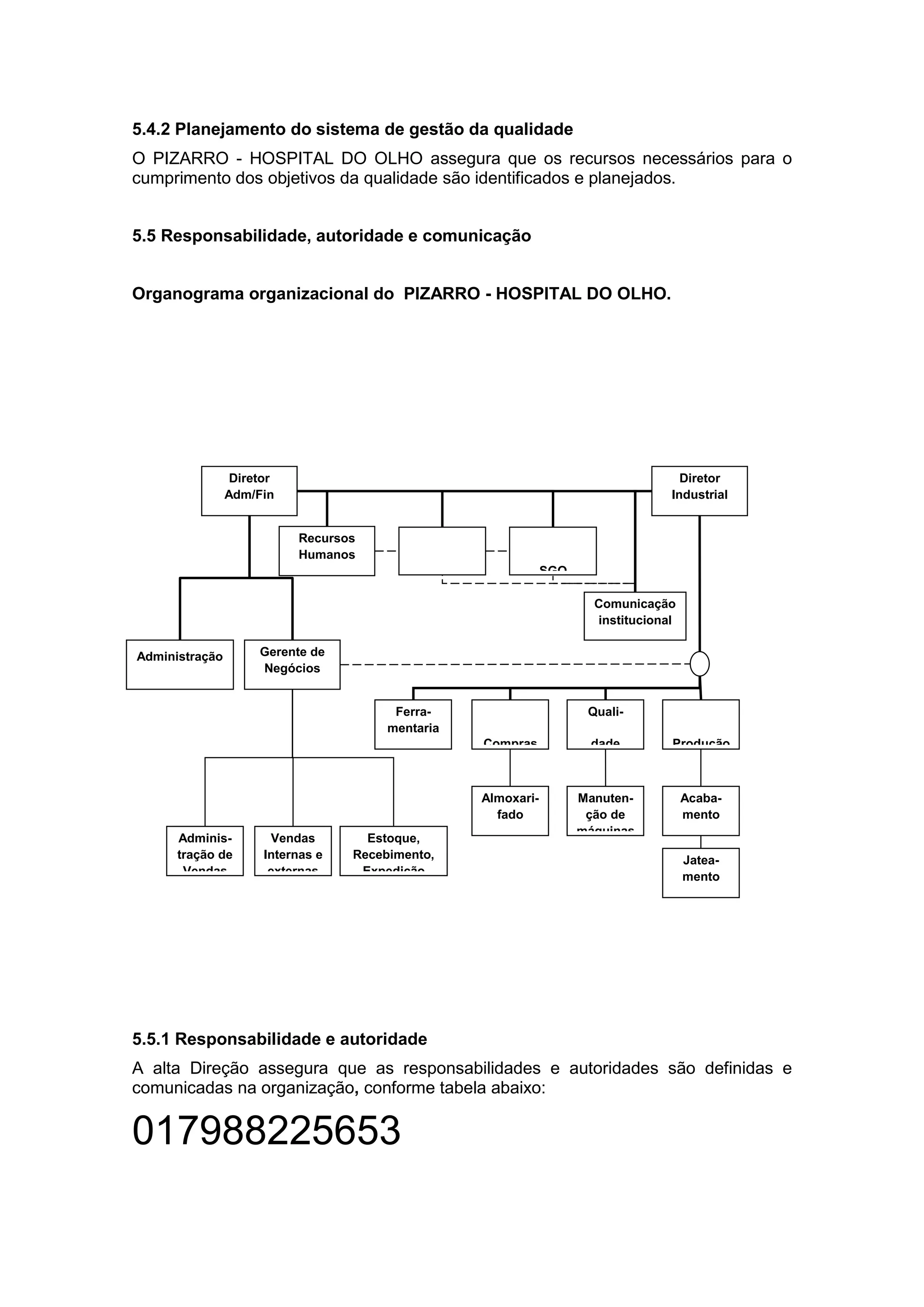 O documento descreve a estrutura organizacional e responsabilidades do sistema de gestão da qualidade do PIZARRO - HOSPITAL DO OLHO. Ele define os representantes da direção e do sistema de gestão da qualidade e assegura que há comunicação efetiva entre as funções sobre os processos do sistema de qualidade.