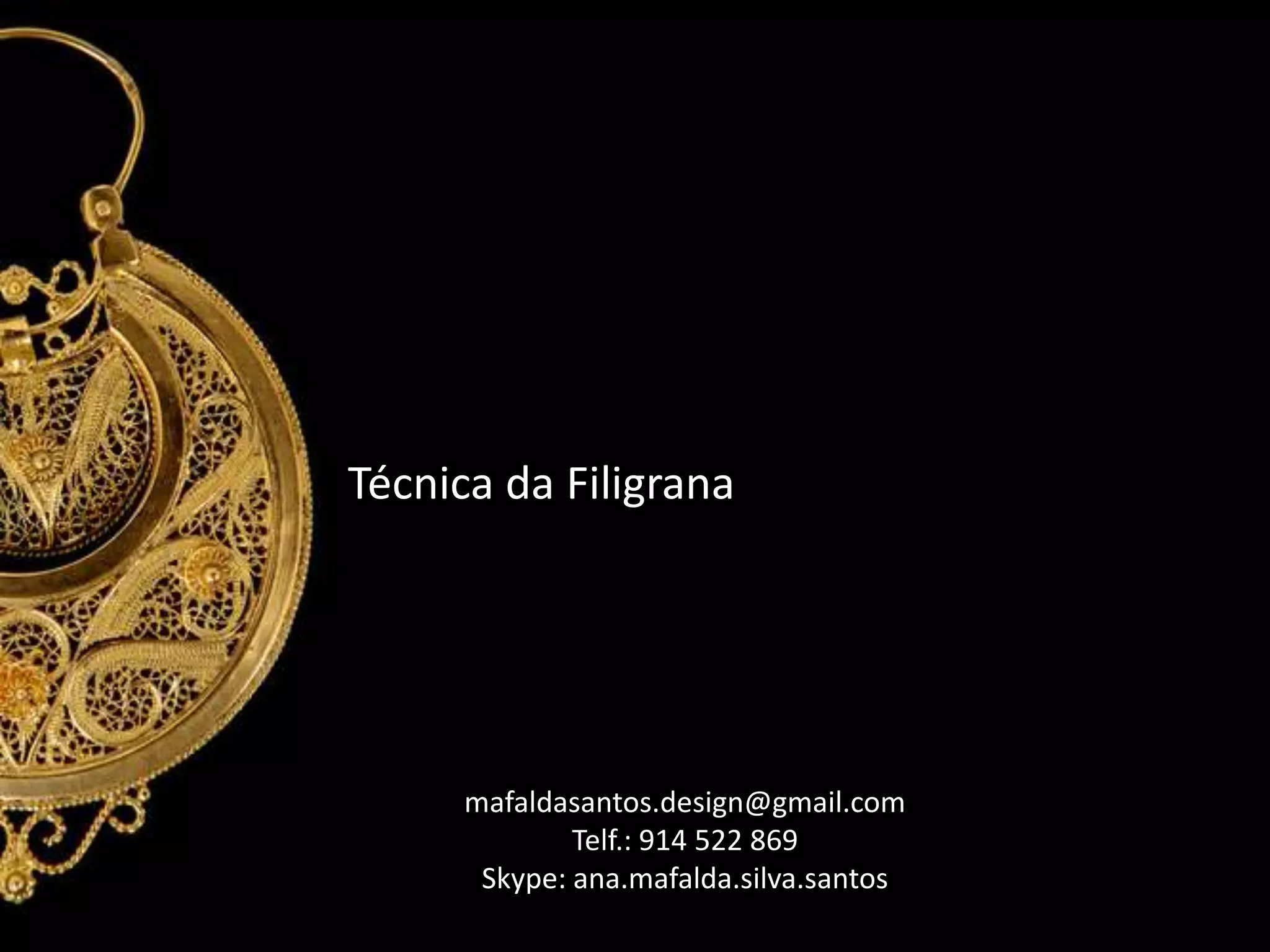 A Filigrana é uma técnica ornamental utilizada na Ourivesaria Portuguesa que envolve a combinação de dois fios finos de metais nobres como ouro e prata, torcidos em pequenos "S" ou em espiral. Embora associada ao Traje de Romaria de Viana, a Filigrana é produzida principalmente em Gondomar e na Povoa do Lanhoso, onde os fios são preenchidos, soldados e submetidos a processos como branqueamento e brunição.