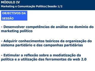 Este documento discute o marketing político em quatro seções: 1) A relação entre marketing e política; 2) O declínio dos partidos políticos; 3) A mediatização da política; 4) A campanha inovadora de Barack Obama que utilizou novos canais de comunicação e marketing direto para conquistar eleitores.