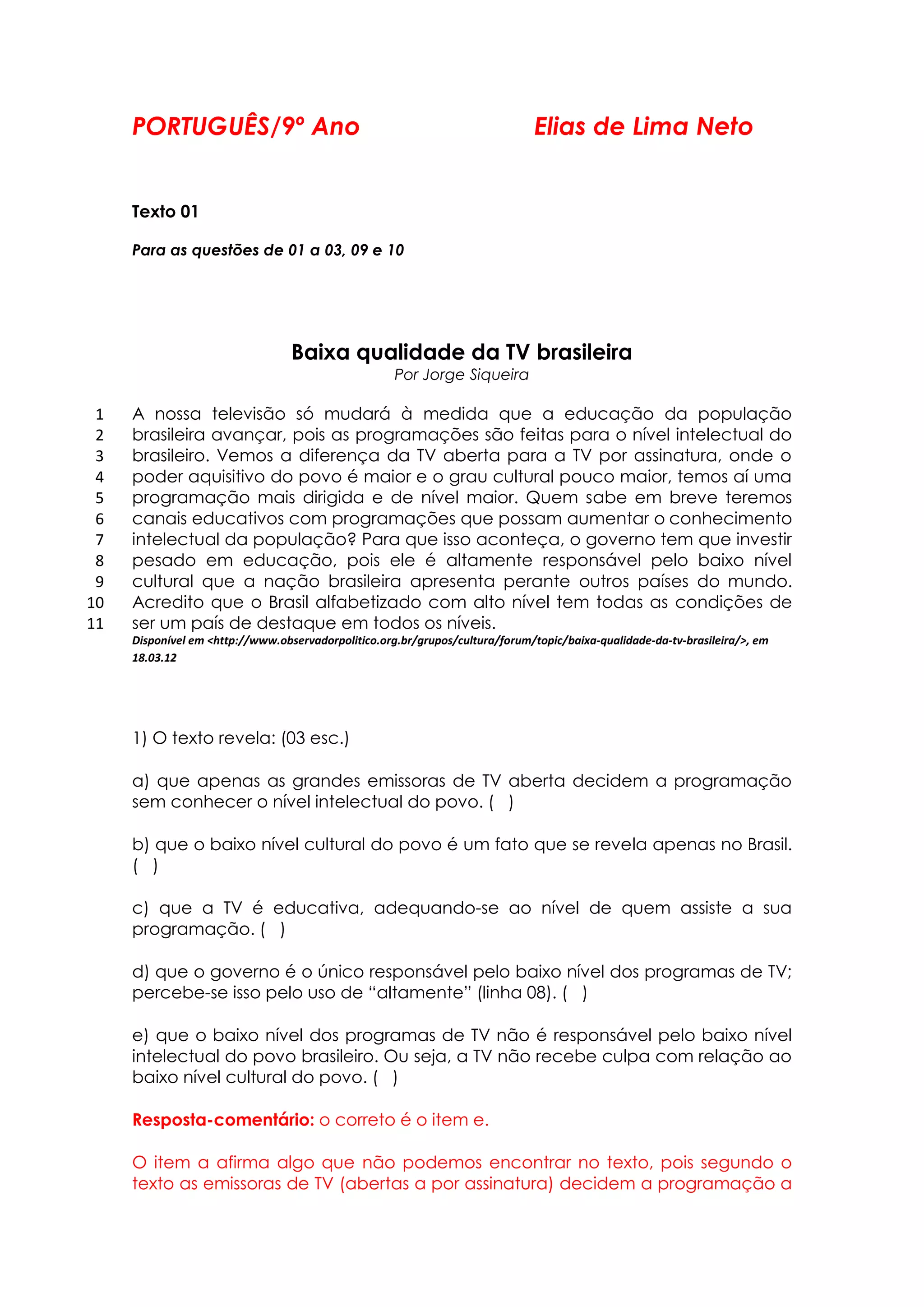 O texto discute a baixa qualidade da programação da TV brasileira. O autor argumenta que (1) as programações são feitas para o nível intelectual do brasileiro e (2) a TV mudará à medida que a educação do povo avançar. Ele também aponta que (3) o governo precisa investir mais em educação para elevar o nível cultural da nação.