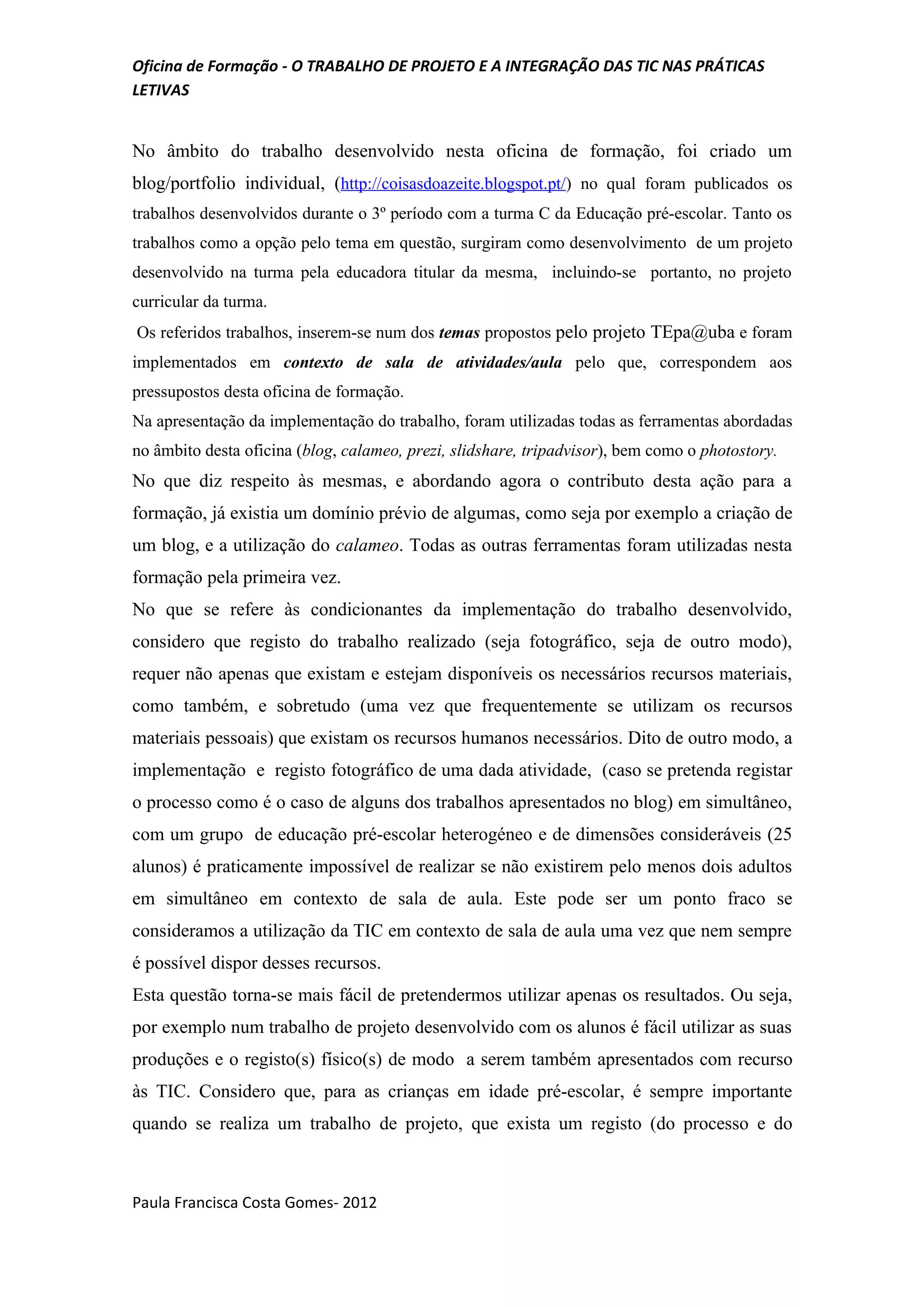 Este documento discute a integração das TIC (tecnologias de informação e comunicação) nas práticas de ensino pré-escolar. Descreve um projeto desenvolvido com crianças pré-escolares que utilizou ferramentas como blogs, calameos e photostories. Também discute os desafios de usar TIC em sala de aula, como a necessidade de recursos humanos e acesso à internet.