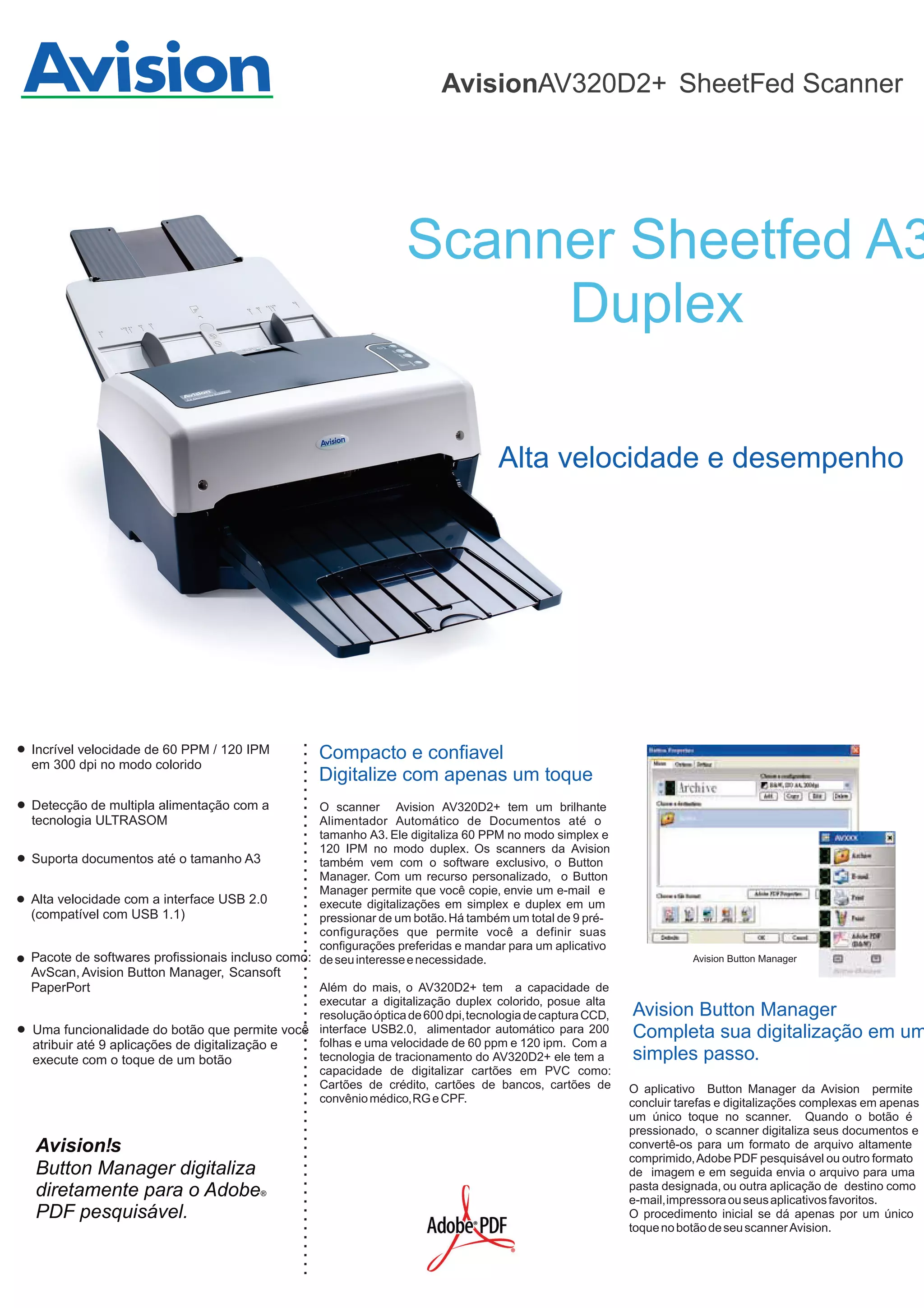 O scanner Avision AV320D2+ é um dispositivo de alta velocidade que digitaliza até 60 ppm em simplex e 120 ipm em duplex, com capacidade para documentos tamanho A3. Ele possui tecnologia de detecção de múltipla alimentação e um software chamado Button Manager que permite digitalizações com um único toque, convertendo documentos para formatos como PDF pesquisável. Com uma resolução óptica de 600 dpi e diversas pré-configurações, o dispositivo é projetado para atender a demandas de digitalização em ambientes de alta produção.