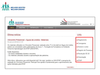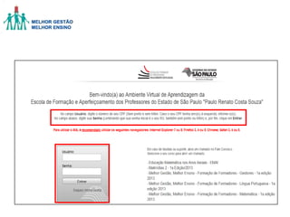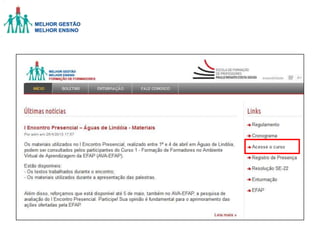 O documento fornece instruções sobre como acessar e navegar no Ambiente Virtual de Aprendizagem (AVA) da Escola de Formação e Aperfeiçoamento do Professor (EFAP). Explica como acessar os cursos e módulos disponíveis, realizar atividades como fóruns, questionários e envio de arquivos, e como acompanhar o progresso por meio da ferramenta "Meu Percurso". Também dá orientações sobre o uso de ícones e ferramentas no AVA.