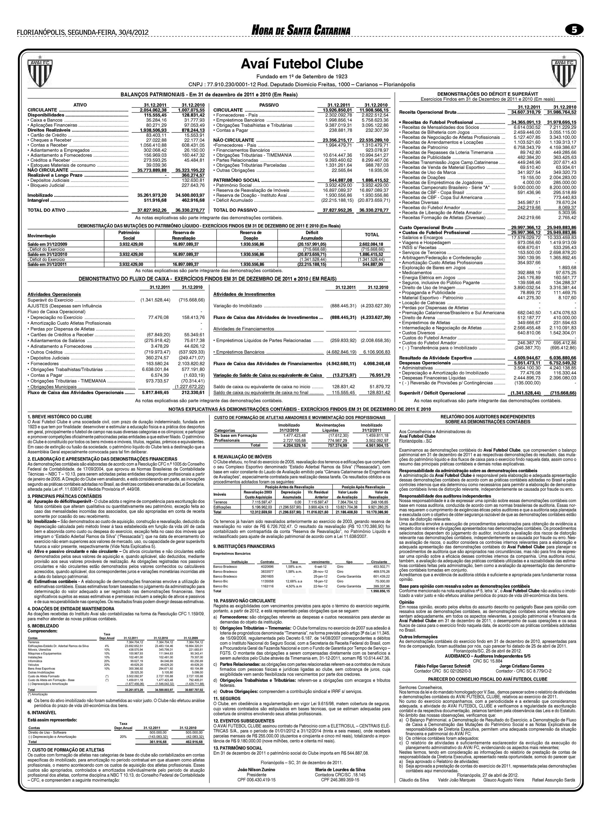 O documento apresenta os balanços patrimoniais e demonstrações de resultados do Avaí Futebol Clube em 31 de dezembro de 2011 e 2010. O ativo total em 2011 foi de R$37,8 milhões, com destaque para imobilizado de R$35,2 milhões. Já o passivo total foi de R$37,8 milhões, sendo R$13,9 milhões de circulante e R$23,4 milhões de não circulante. A receita operacional bruta em 2011 foi de R$34,6 milhões e o déficit acumul