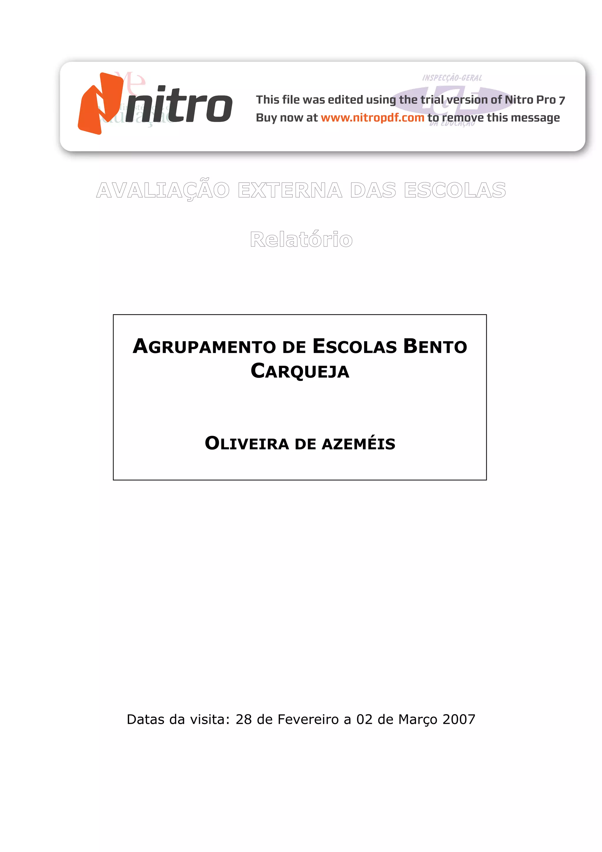 Este relatório apresenta os resultados da avaliação externa do Agrupamento de Escolas Bento Carqueja em Oliveira de Azeméis, realizada entre 28 de Fevereiro e 2 de Março de 2007. O agrupamento atende a cerca de 2200 alunos distribuídos por várias escolas. Os resultados escolares têm sido superiores à média nacional e o abandono é residual. Há esforços para incluir todos os alunos, embora as estratégias de diferenciação necessitem ser mais sistemáticas. A organização e gestão escolar é consider
