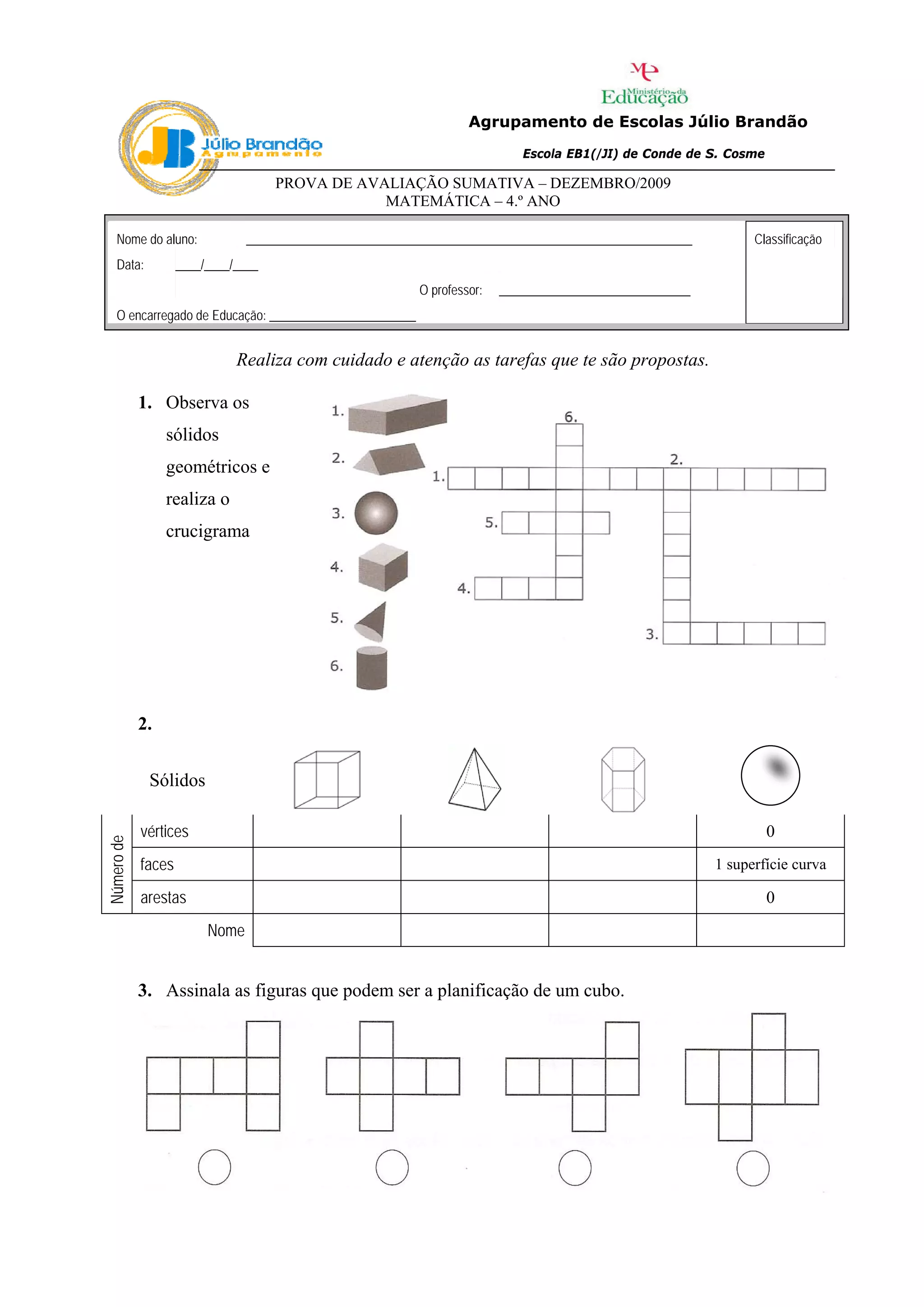 1) O documento apresenta uma prova de avaliação sumativa de matemática para o 4o ano com 15 questões.