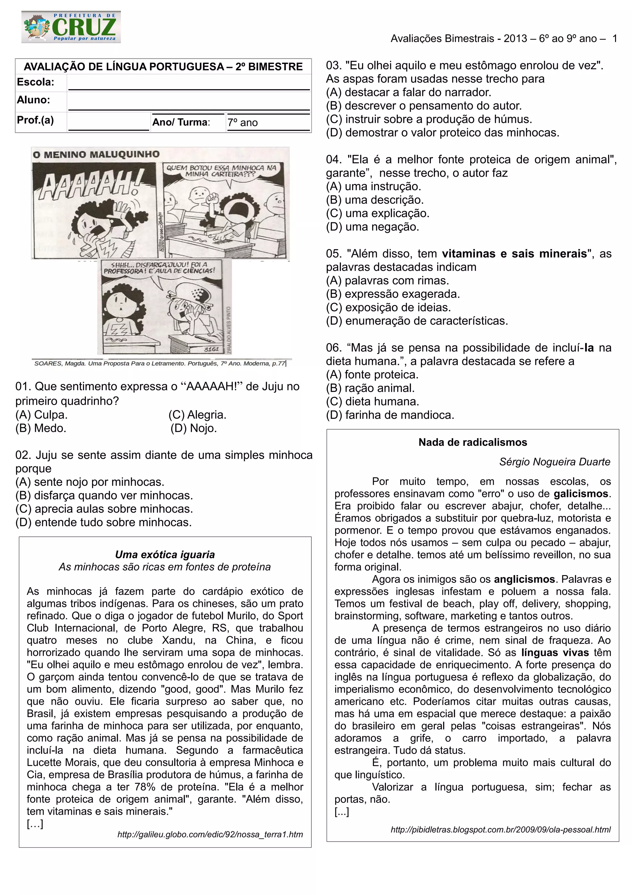 Avaliações Bimestrais -2013 – 6º ao 9º ano – 1
