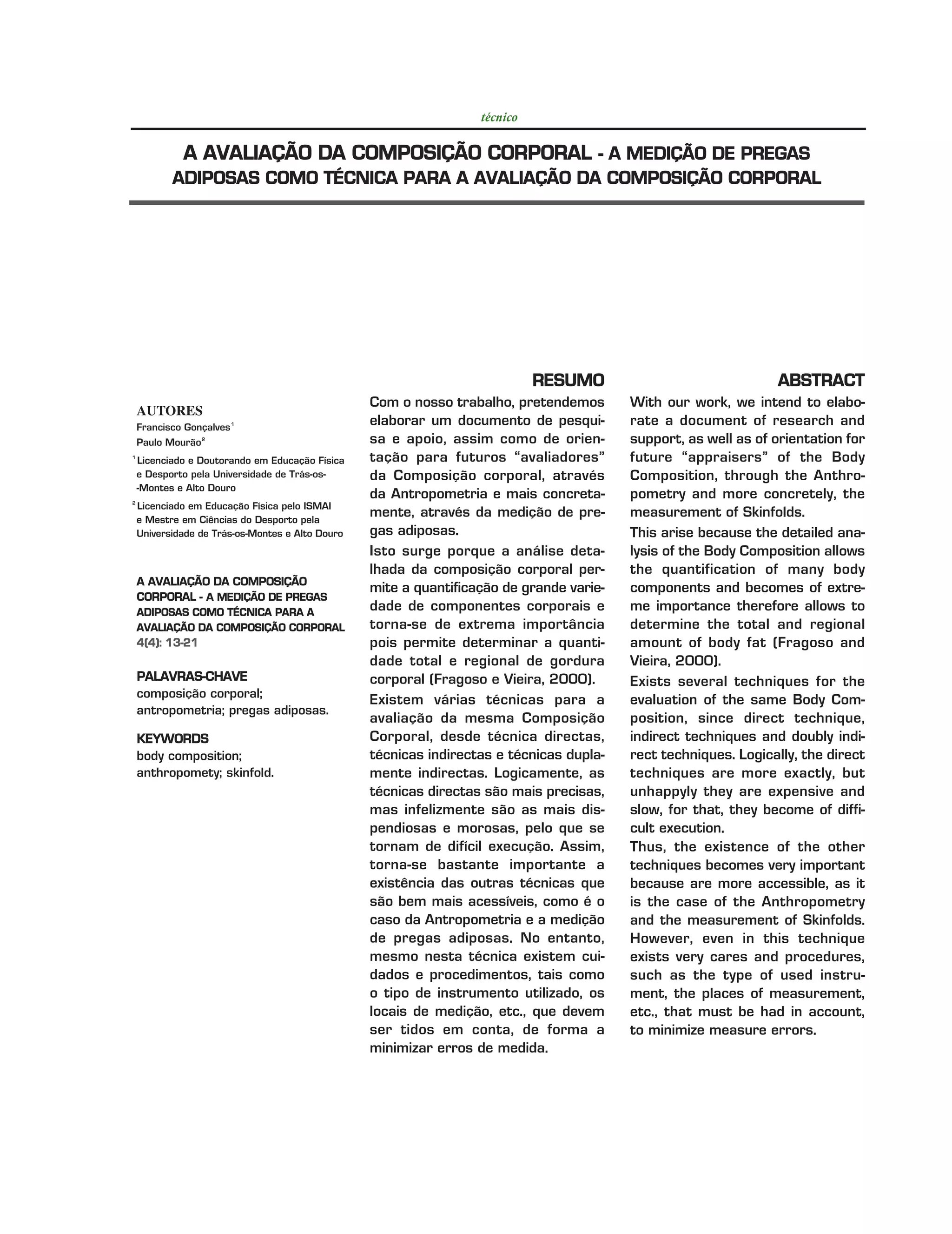 O documento discute a avaliação da composição corporal através da medição de pregas adiposas. Ele descreve a importância de medir a composição corporal para avaliar a saúde e o desenvolvimento físico. Também explica que existem vários métodos para medir a composição corporal, sendo a medição de pregas adiposas um método indireto mais acessível em comparação com métodos diretos mais precisos e caros.