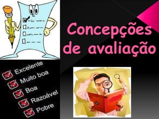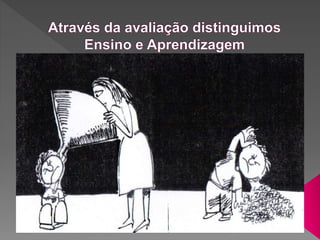 A fábula descreve a conversa entre uma rainha e seu espelho mágico sobre avaliação. O espelho explica que avaliar não é mais uma tarefa simples e que requer considerar múltiplos fatores, como o propósito da avaliação, os critérios e métodos a serem utilizados. A rainha fica confusa com as complexas questões levantadas pelo espelho sobre avaliação.