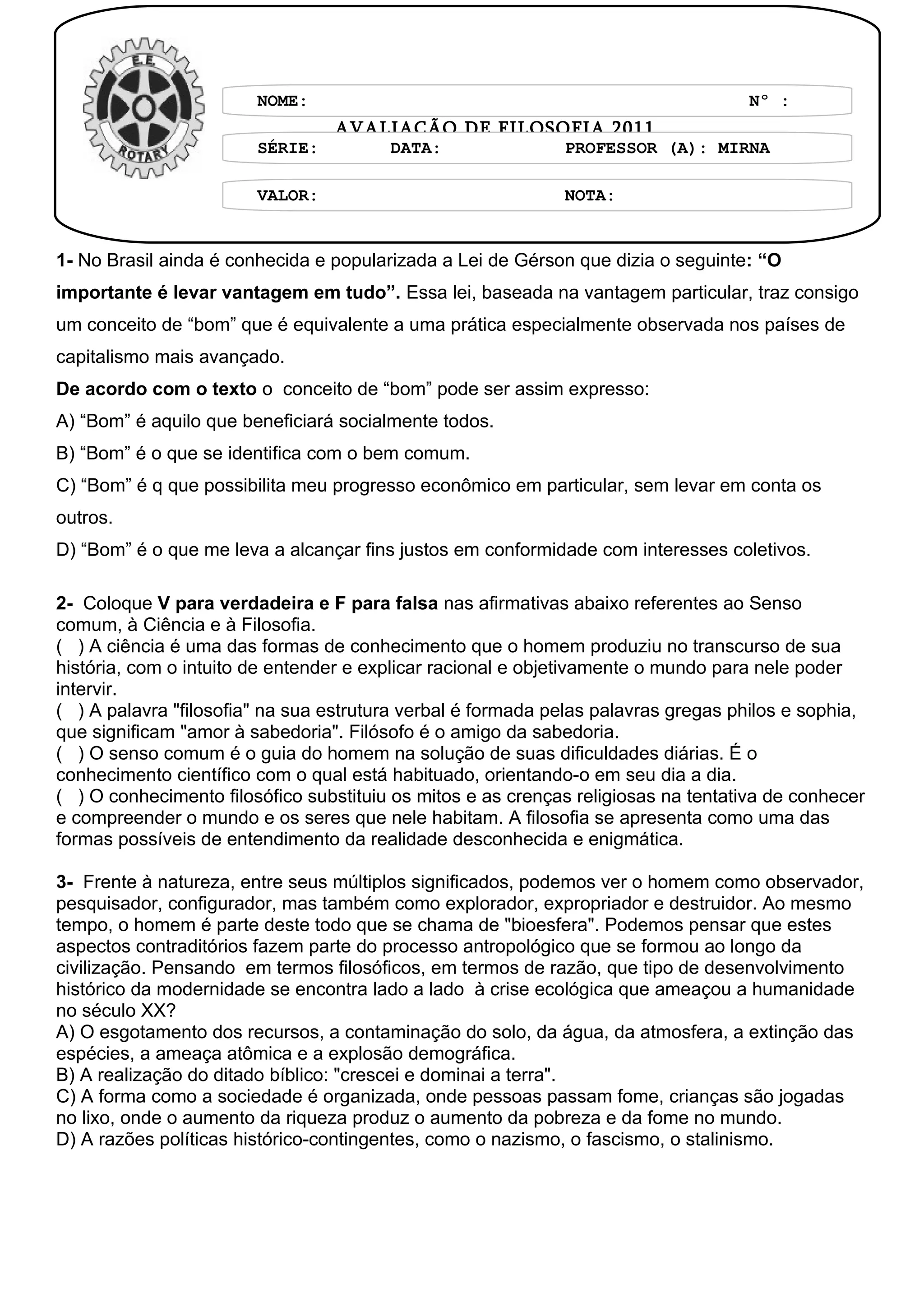 O documento contém 10 questões de múltipla escolha sobre filosofia. As questões abordam tópicos como ética, moral, bullying, mitologia, diferenças entre senso comum, ciência e filosofia.
