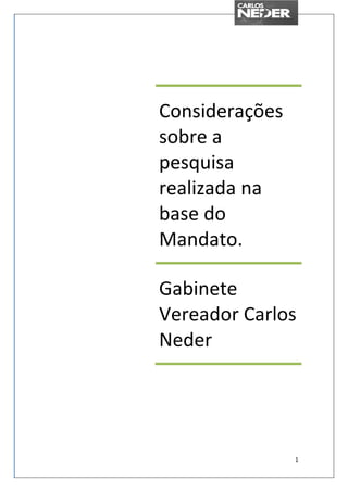 O documento apresenta os resultados de uma pesquisa realizada com a base social do mandato do Vereador Carlos Neder entre abril e junho de 2011. A pesquisa teve como objetivo mapear as características da militância e obter subsídios para melhorar a articulação do grupo e preparar formações políticas e sociais. Algumas descobertas importantes foram: 1) Há um equilíbrio entre filiados e não filiados ao PT; 2) Poucos militantes participam ativamente do partido ou de setoriais; 3) A comunicação com a