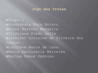 Este documento analisa um jogo educativo chamado "Jogo das Frutas" para educação infantil. Ele fornece descrições do jogo, recursos necessários, como funciona e análises pedagógicas, didáticas e de conteúdo, concluindo que o jogo promove pensamento lógico, atenção e aprendizagem participativa de forma adequada para a idade.