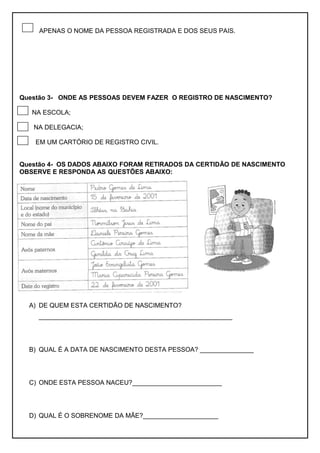 Este documento contém 6 questões sobre certidão de nascimento, árvore genealógica e diferenças físicas entre pessoas. As questões abordam dados contidos em uma certidão de nascimento específica, a árvore genealógica da família de Bárbara e características físicas que tornam as crianças diferentes.