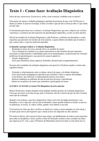 O documento discute como realizar uma avaliação diagnóstica no início do ano letivo para (1) verificar se os alunos têm os pré-requisitos necessários para novas aprendizagens, (2) identificar possíveis problemas de aprendizagem e (3) caracterizar comportamentos como apatia. O professor deve elaborar atividades que avaliem os objetivos e pré-requisitos que os alunos devem ter adquirido na série anterior para planejar intervenções pedagógicas específicas.