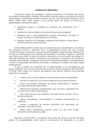 Este documento discute a avaliação em matemática. A avaliação deve promover o aprendizado dos alunos através de feedback, segurança e diálogo. Uma professora implementou novos modos de avaliação formativa incluindo portfólios, relatórios de pesquisa e projetos em grupo. Os alunos e pais ficaram mais envolvidos e a avaliação melhorou o aprendizado.