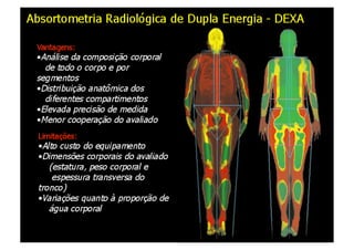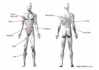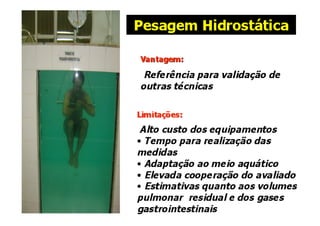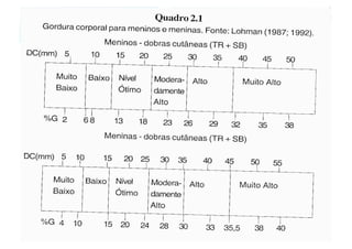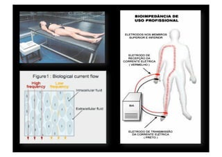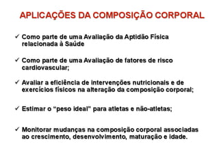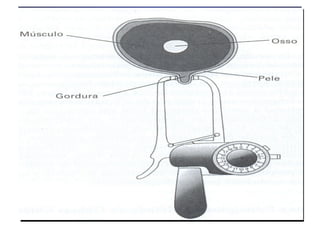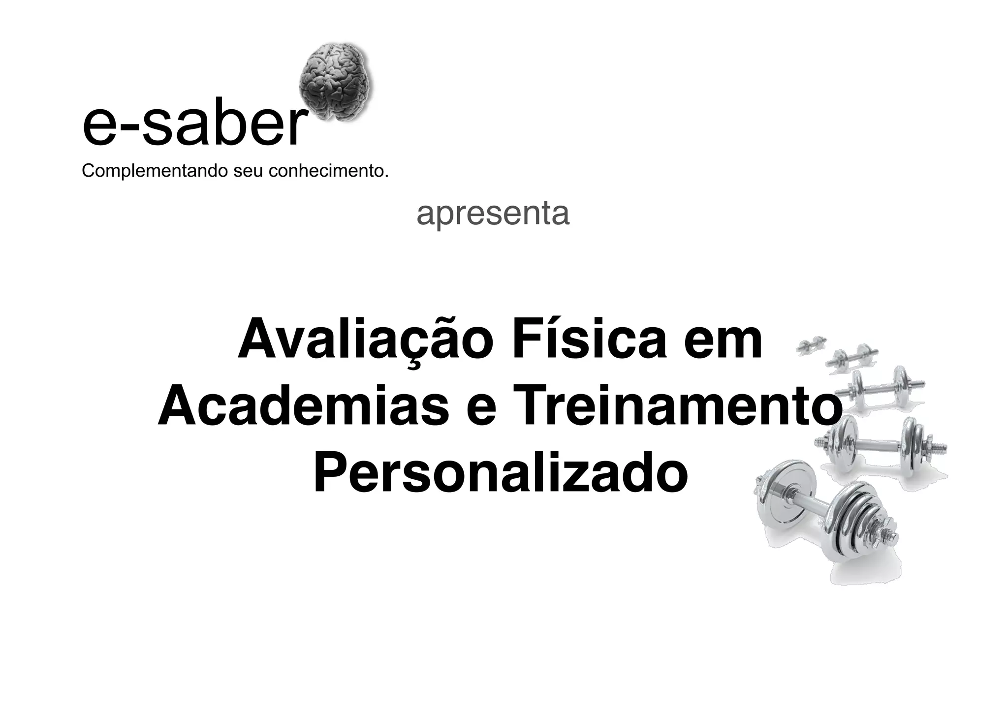 O documento discute a avaliação física em academias e treinamento personalizado. Apresenta diferentes métodos de avaliação da composição corporal, incluindo a bioimpedância elétrica, medidas antropométricas como dobras cutâneas e circunferências, e o cálculo do índice de massa corporal. Discute também como interpretar os resultados dessas avaliações para estabelecer metas de composição corporal e treinamento personalizado para cada cliente.