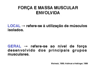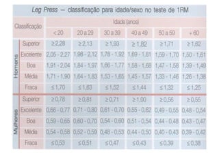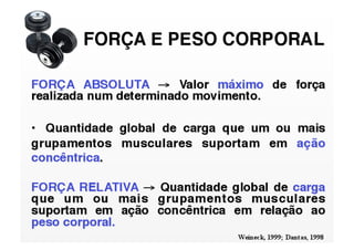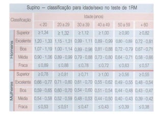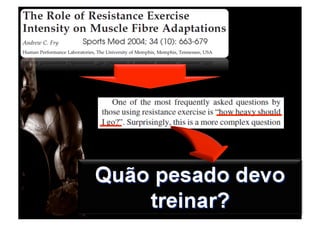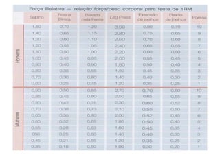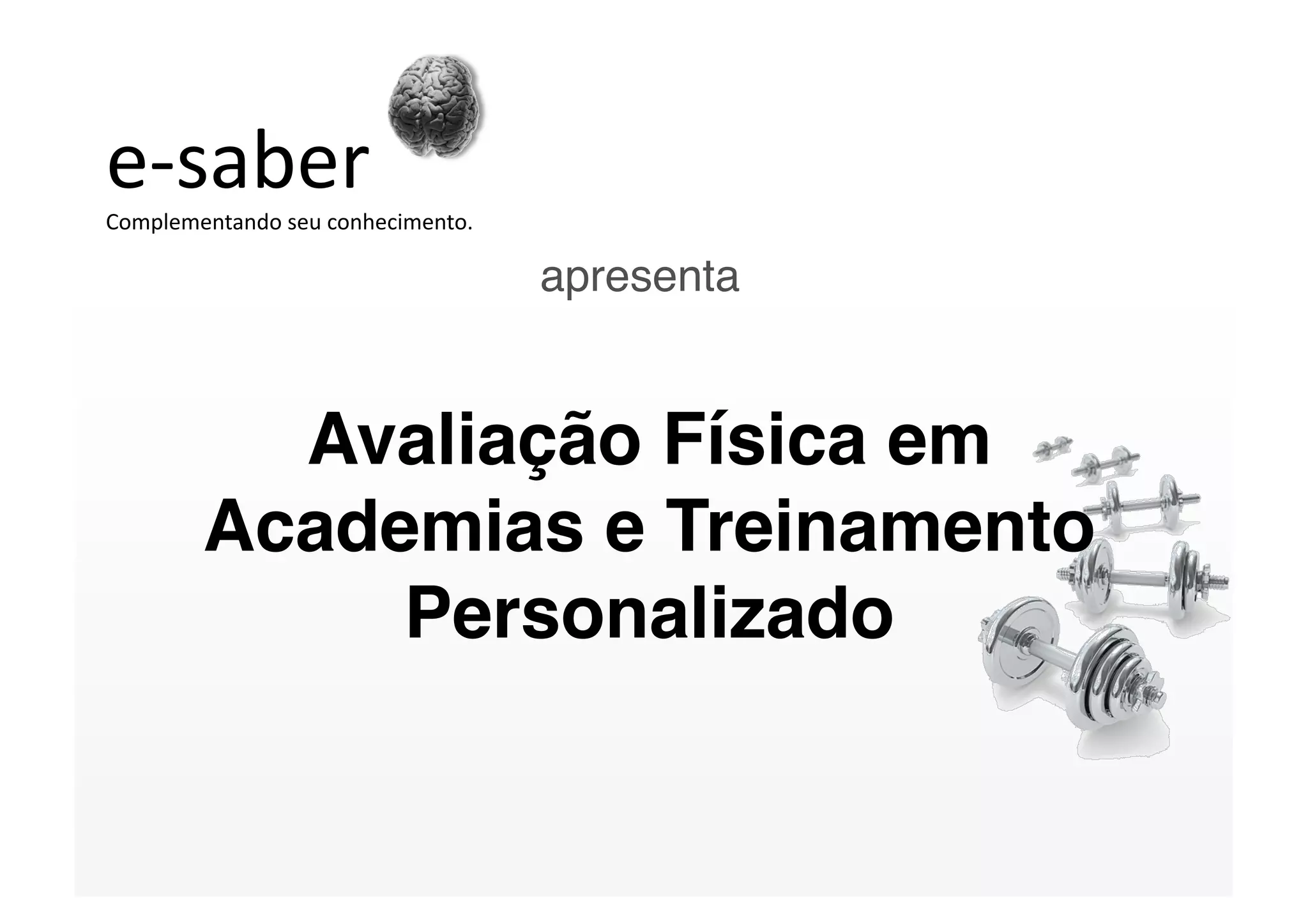 O documento apresenta informações sobre avaliação física em academias e treinamento personalizado, abordando três tópicos principais: 1) avaliação da força muscular, 2) parâmetros para individualização do treinamento de força, e 3) diretrizes para programas de treinamento de força, hipertrofia, potência e resistência muscular localizada.