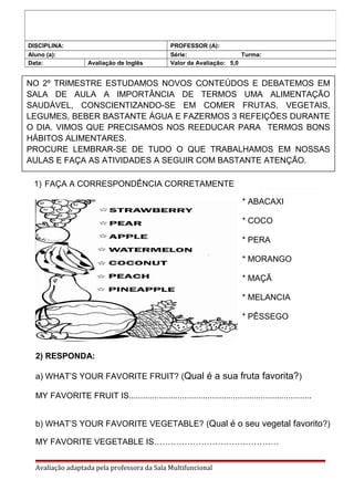 Este documento apresenta uma avaliação de Inglês para alunos do 2o trimestre. A avaliação contém questões sobre alimentos, frutas, cores e ingredientes para fazer limonada em Inglês.