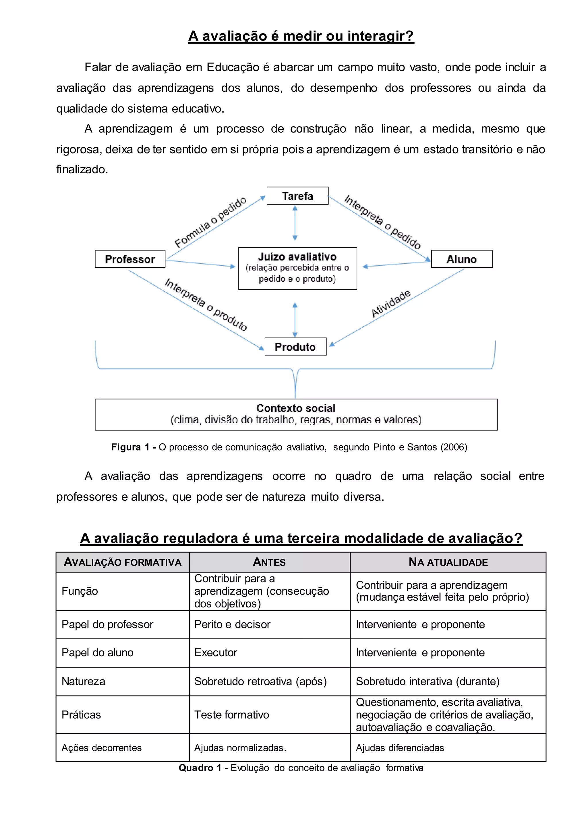 O documento discute a avaliação formativa na educação, definindo-a como um processo interativo e contínuo que visa apoiar o aprendizado do aluno. Argumenta que uma avaliação efetiva deve direcionar-se ao aluno, fazer parte do processo de ensino e aprendizagem, e envolver tanto resultados quanto processos para melhorar a compreensão.
