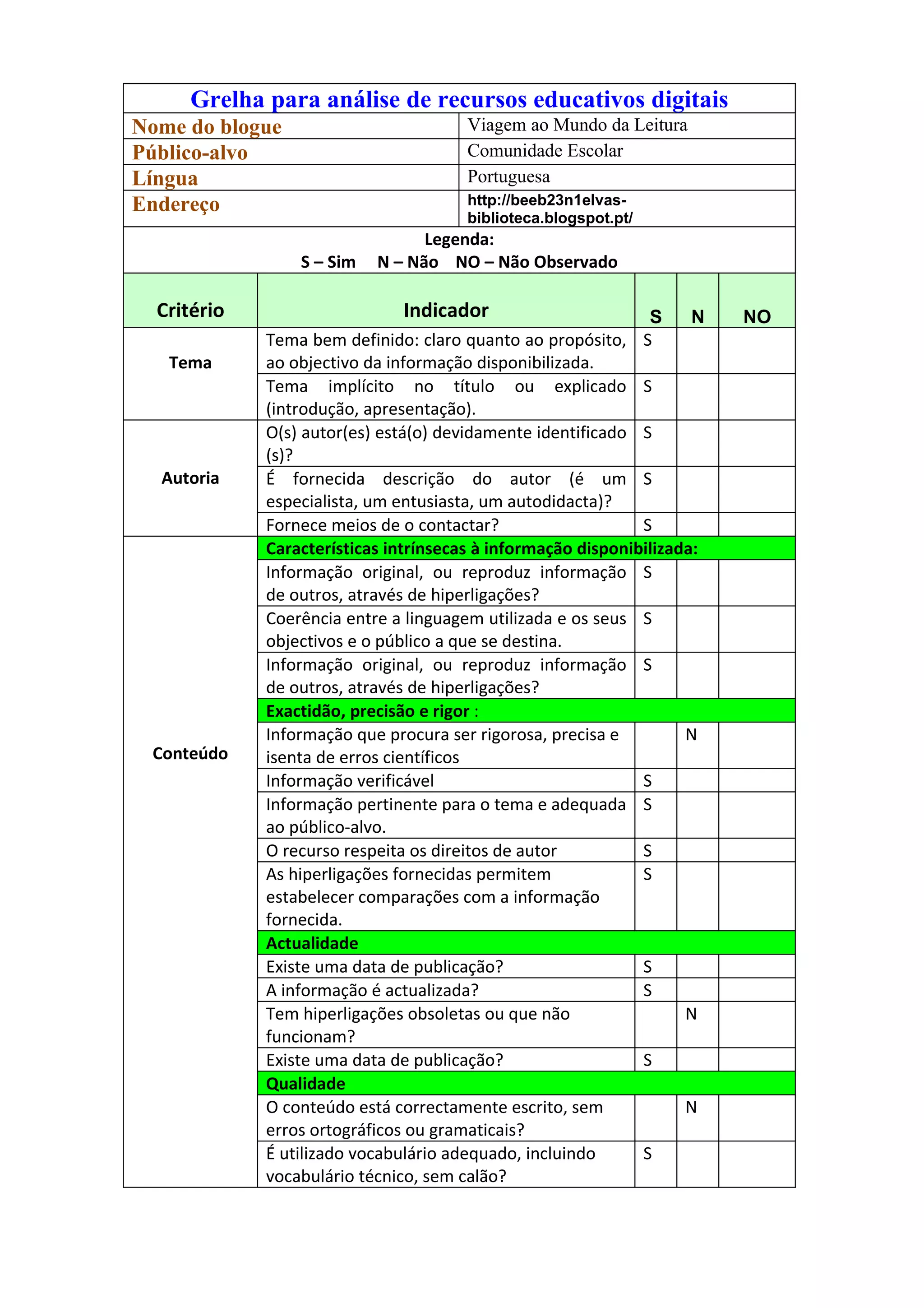 O documento apresenta uma grelha para análise de um blogue educativo chamado "Viagem ao Mundo da Leitura". A grelha avalia o blogue com base em critérios como tema, autoria, conteúdo, acesso, usabilidade, desenho gráfico e multimédia, relação com o utilizador e acessibilidade. De acordo com a análise, o blogue tem um tema bem definido e identifica claramente os seus autores, mas carece de rigor em alguns dos seus conteúdos e funcionalidades.