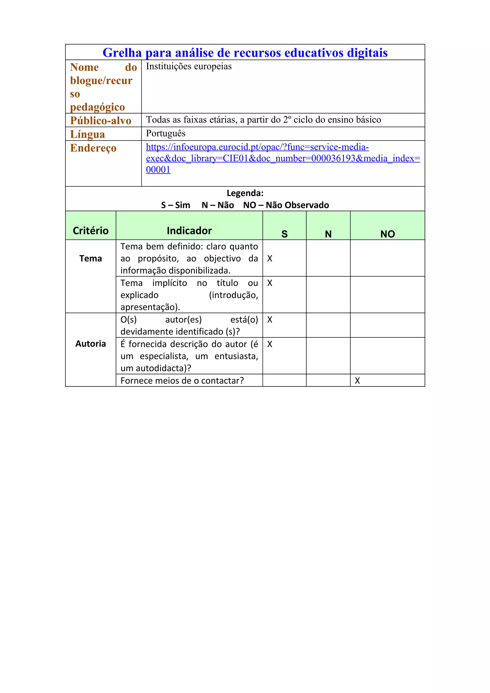 Este documento fornece uma grelha para analisar recursos educativos digitais, avaliando critérios como tema, autoria, conteúdo, acessibilidade e usabilidade. O recurso em questão é um site sobre instituições europeias destinado a alunos do 2o ciclo em diante e fornece informações factuais e atualizadas sobre a União Europeia de forma clara e acessível.