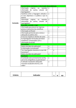 Este documento analisa as características do blogue "Viagem ao Mundo da Leitura" em termos de tema, autoria, conteúdo, actualidade, qualidade, acesso e usabilidade, desenho gráfico e multimédia, relação com o utilizador, conservação e comunicação e acessibilidade. Em geral, o blogue cumpre os critérios analisados, fornecendo informações originais e actualizadas sobre literatura para a comunidade escolar.