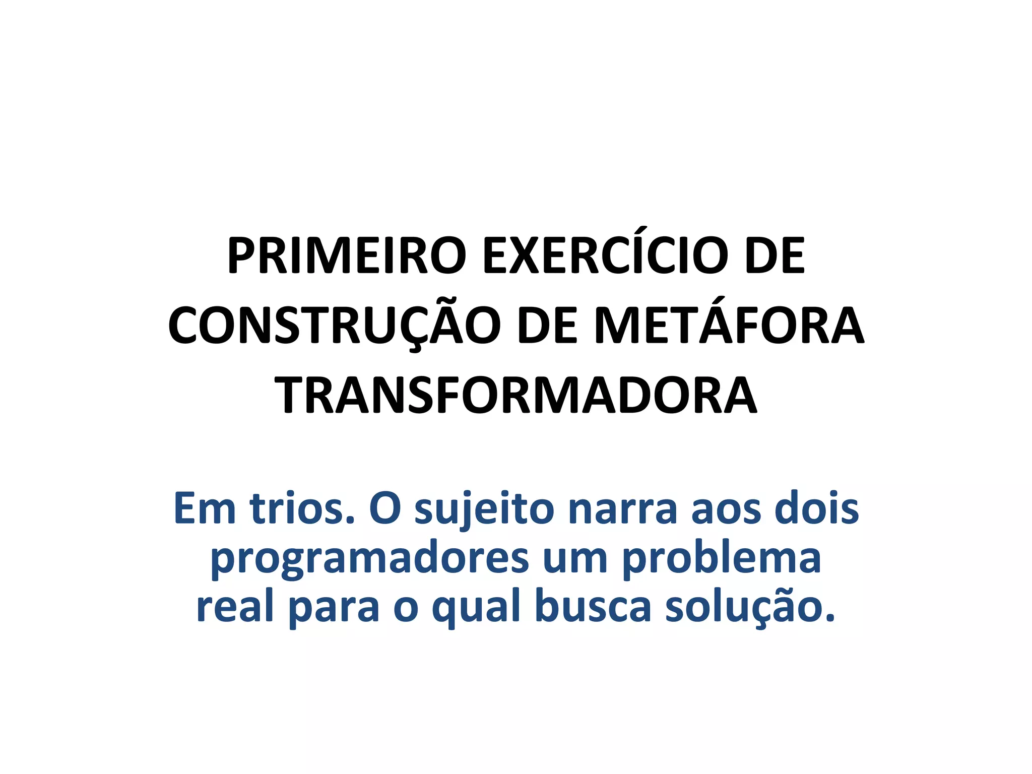 O documento descreve um exercício de construção de metáforas transformadoras entre um sujeito e dois programadores, centrado em problemas de comunicação com filhos adolescentes. Os programadores usam analogias, como lápis e machado, para ajudar o sujeito a repensar sua abordagem. Além disso, sugere aspectos importantes na construção de metáforas, como sutileza e ecologia, e propósitos potenciais, como ressignificação e acesso a recursos.