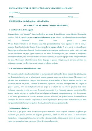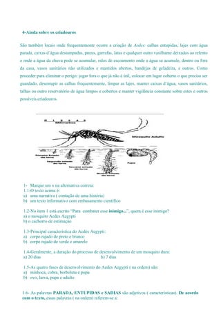 O documento fornece informações sobre o mosquito Aedes aegypti, vetor da dengue. Descreve suas características físicas, ciclo de vida, hábitos alimentares e como ocorre a transmissão da dengue. Também lista locais que podem se tornar criadouros do mosquito e medidas para eliminá-los.